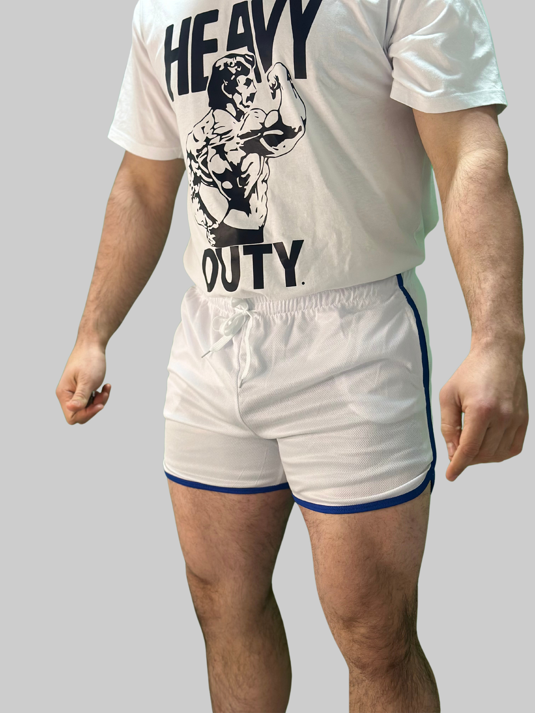 Pantalones cortos para gimnasio, color blanco con bordes cubiertos de azul.